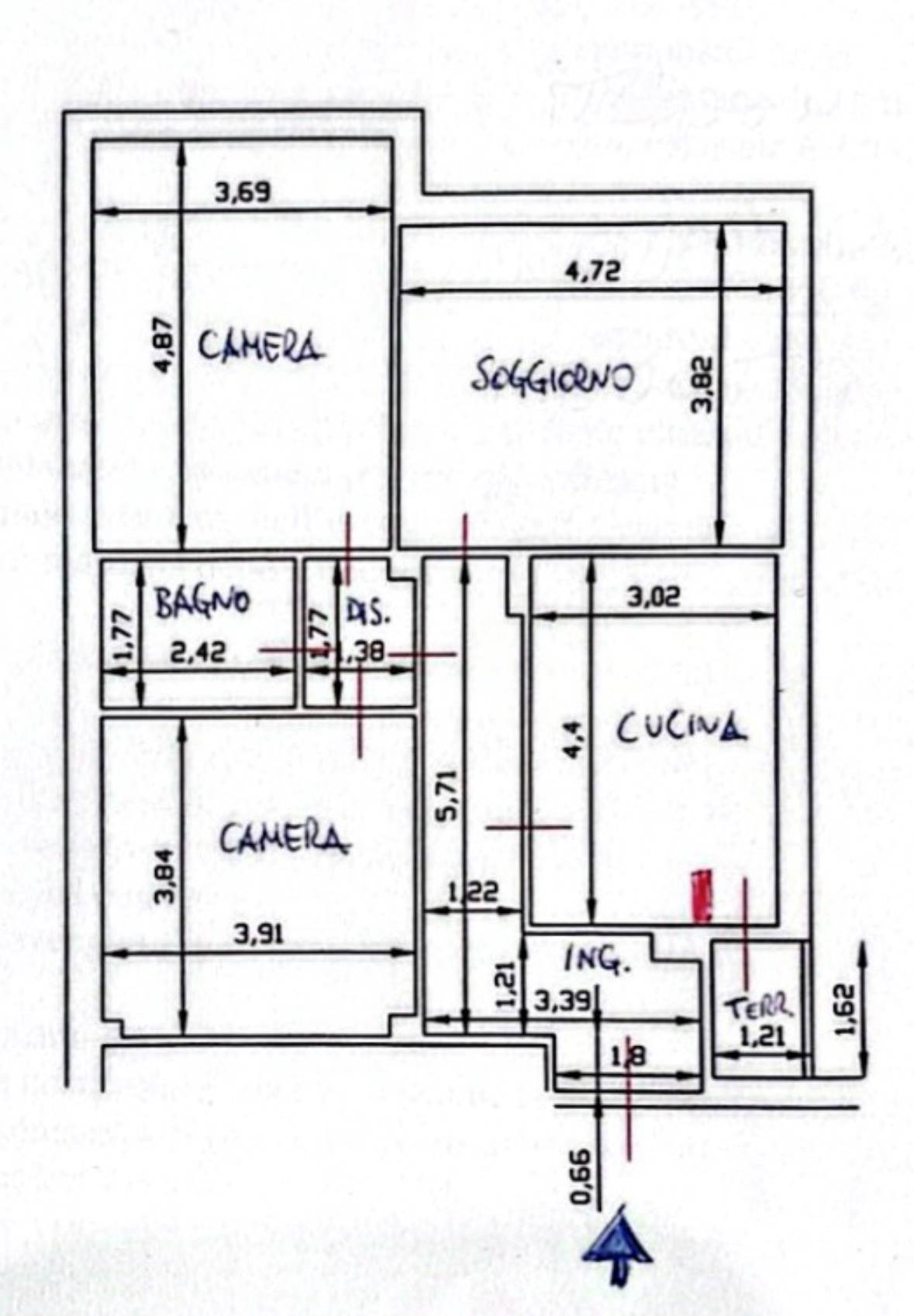 Ingresso, cucina abitabile con piccola loggia provvista di pilozzo, sala, disimpegno lato notte, 2 camere MATRIMONIALI, bagno finestrato.